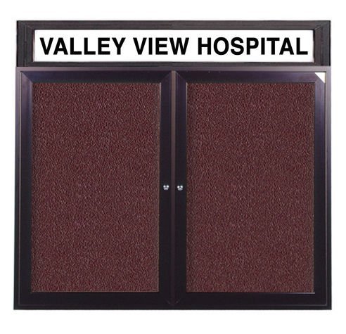 The deluxe enclosed headliner bulletin boards are anything but an ordinary message center. Tackable back panels are constructed of self-healing natural cork for indoor units and a sealed-back natural colored vinyl for outdoor applications. Complete with lockable hinged doors and shatter-resistant acrylic, Headliners are available in either bronze or satin anodized aluminum. Headliners include a 6" high white acrylic header panel to clearly identify your organization's name for all to see. Standard lettering on header is done in uppercase, helvetica-style black letters and is sized and centered on the opaque panel depending on requested name. Available with an illuminated or non-lighted acrylic header panel. Illuminated units feature U.L. Listed fluorescent fixture, bulb, and a three wire electrical lead. These durable aluminum framed units can be ordered for either indoor or outdoor models. Size: 48" x 60". Surface: Vinyl Bulletin Board. Surface Color: Berry. Frame Style: Bronze Aluminum. Number of Doors: 2. Headliner: 6" White Acrylic Header Panel. Header Lettering: Black Uppercase Helvetica Style. Features: Set 3/4" Letters, Numbers, Characters, Shatter-resistant Acrylic, Lockable Doors.